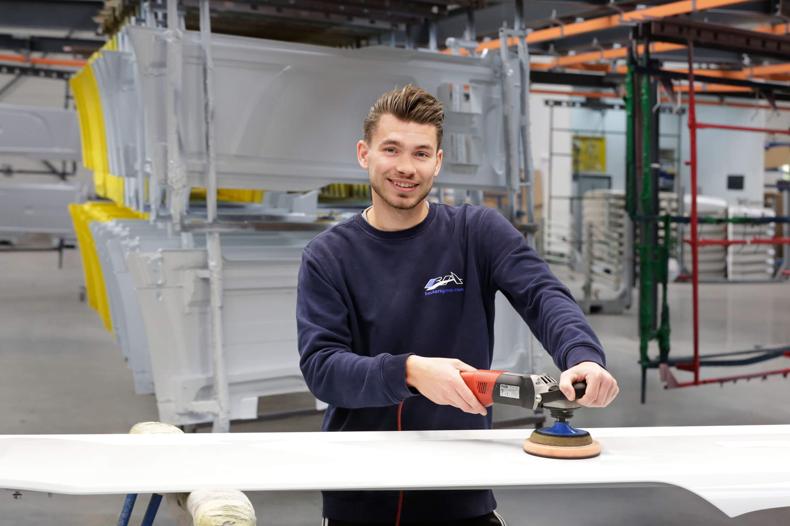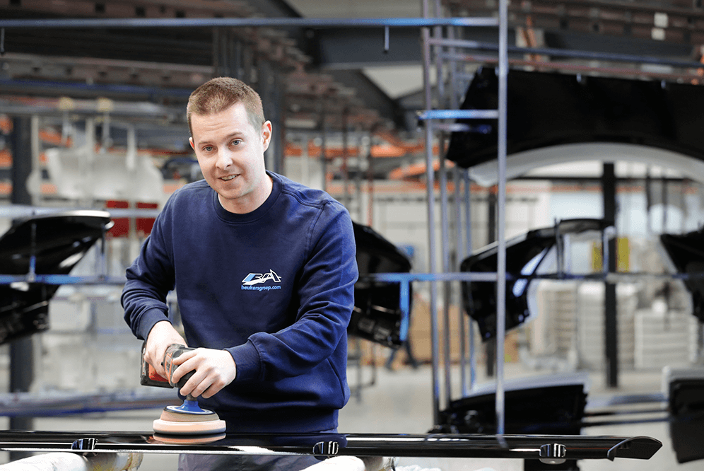 De industriële lakkerij van de Beukers Groep is gevestigd in Lommel. Drie laklijnen met vier robots zorgen ervoor, dat het spuitwerk altijd voldoet aan de hoogste kwaliteitsnormen. Maar de robots kunnen het niet alleen. Menselijke inbreng blijft noodzakelijk.